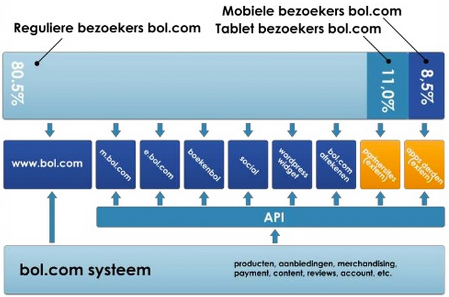De API geldt daarbij als backbone, want het levert externe partijen (affiliates) de mogelijkheid om voort te bouwen op de infrastructuur van Bol.com. Dat gaat bij Bol.com zelfs zó ver, dat het geen eigen apps heeft voor mobiel en tablet, maar vertrouwt op de apps die deze derde partijen ontwikkelen.