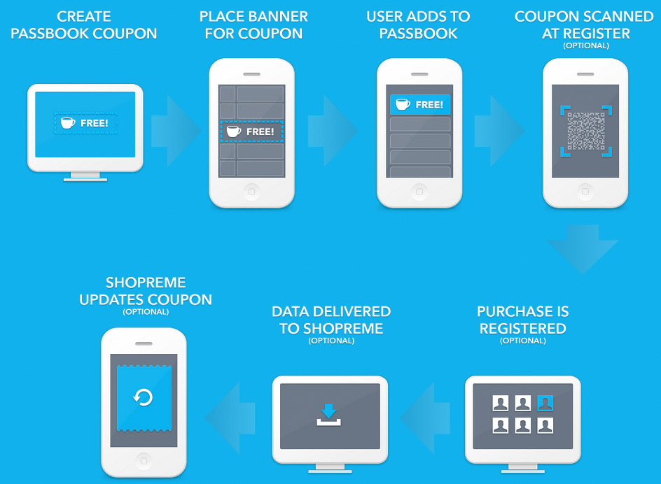Tijdens de sessie werd ook Shopreme gepresenteerd, ontwikkeld door Moop.Me en moblio.nl. Deze dienst biedt een mooie combinatie tussen mobiele bannering en couponing. Binnen iOS kunnen gebruikers banners aanklikken, waarna ze direct de mogelijkheid krijgen om een coupon op te slaan in het met iOS 6 geïntroduceerde Passbook.