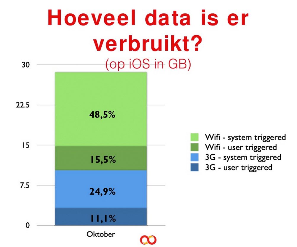 Uit het onderzoek bleek verder dat 73,5% (!!!) van al het dataverbruik van de iOS-ers (wifi en 3G gecombineerd) 'system-triggered' is: dit betreft dus updates, automatische checks op e-mails, etc.