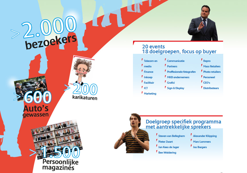 Om de beleving ‘emotioneel’ te laden en goed te laten beklijven, was er ook veel aandacht voor ‘fun en verrassingen’ in de ‘experience zone’. Een gepersonaliseerd programmaboekje, mobiel geprint via de eigen naambadge voorzien van RFID-chip, green screen-fotografie, karikatuurtekeningen via de iPad, een persoonlijk fotolijstje waar de professionele gemaakte profielfoto meteen in kon. Deze foto werd geprint op de cover van een persoonlijke ‘glossy’ en voorzien van eventspecifieke quotes en foto’s. En natuurlijk waren er heerlijke ‘echte’ Bossche bollen voor thuis en indien gewenst: een gewassen auto aan het einde van de dag.
