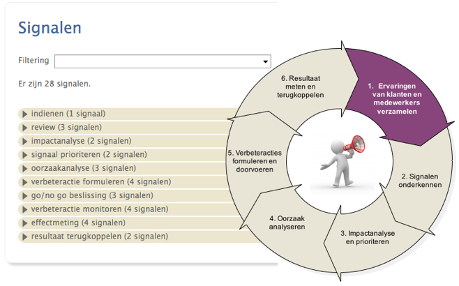 Ten tweede moet je nadenken over wat je van die signalen moet weten, welke kenmerken wil je meegeven zodat je straks ook de juiste management informatie hebt (het kanaal, het product, het klantproces enzovoort), dus waar gaat het signaal over. En als derde moet je ervoor zorgen dat deze mensen niet allemaal dezelfde signalen dubbel gaan indienen, maar dat men van elkaar weet welke signalen er al lopen.
