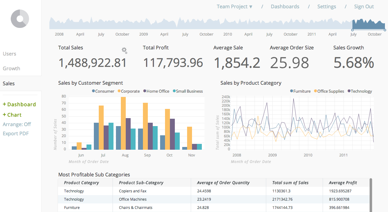 Kijk maar eens naar onderstaande voorbeelden van een goed en een slecht KPI-dashboard. Het eerste dashboard geeft data weer, alleen weet je hierbij niet of dit nu goed is of slecht is. Op basis van dit dashboard kan je geen actie ondernemen. De trend in de tijd staat hier ook, maar vanwege het grote tijdsverschil (2008-2015 in maanden) lopen alle lijnen dwars door elkaar heen.