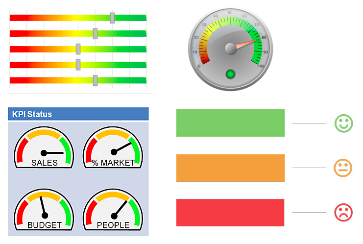 Het oog wil natuurlijk ook iets. Bovenstaande stoplichten zijn niet altijd even mooi gevisualiseerd. Maar gelukkig heeft de marketingwereld hier oplossingen voor! Denk aan metertjes, staafdiagrammen, kleurvakjes of andere manieren om aan te geven of het goed gaat.