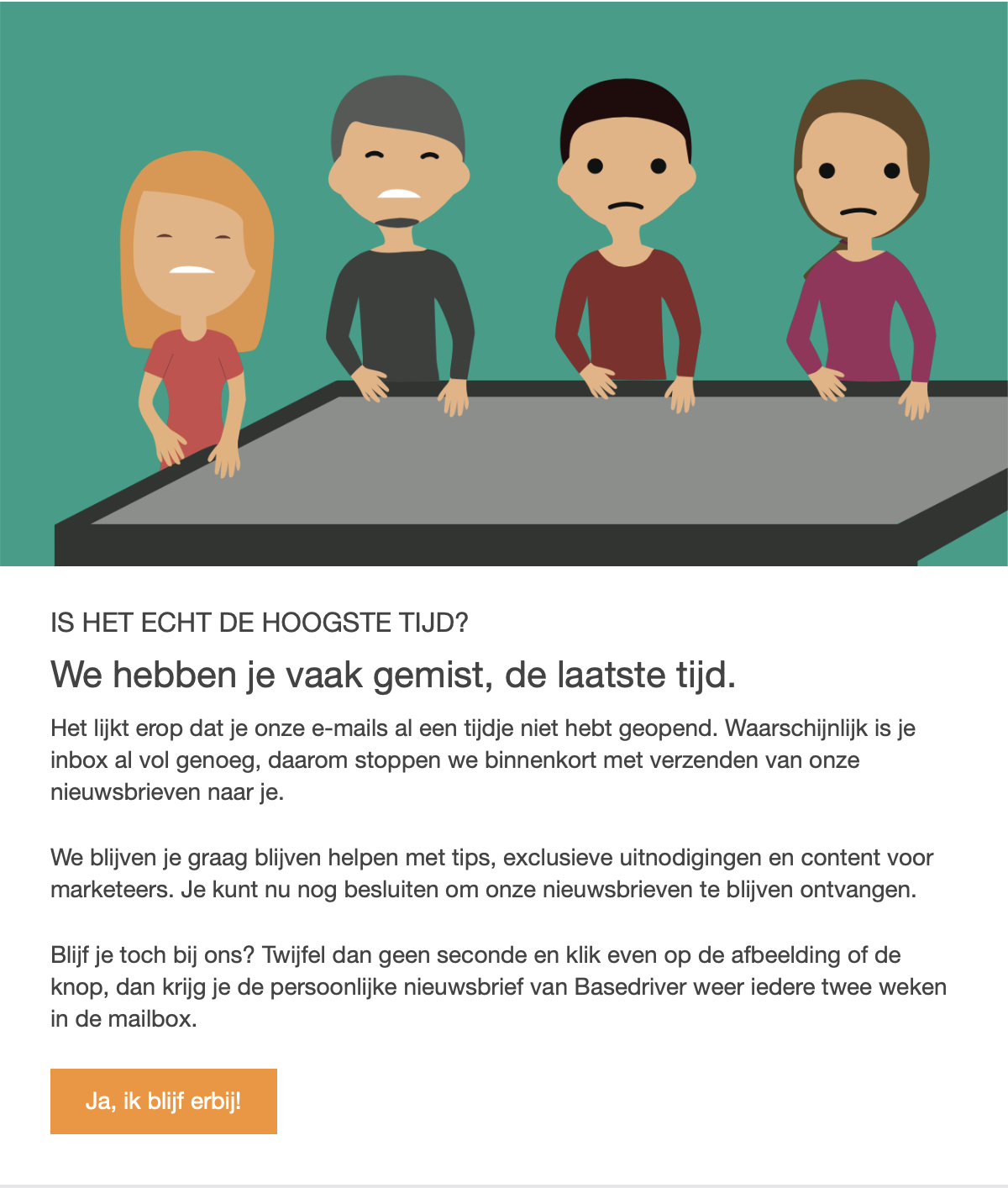 Wij werken veel voor abonnementsbedrijven, uit onderzoek bij onze klanten hebben we gezien dat als mensen hun e-mail niet meer openen, de kans groter wordt dat ze het abonnement opzeggen. Daarom kan retentie een belangrijk onderdeel zijn van een heractivatie-campagne.