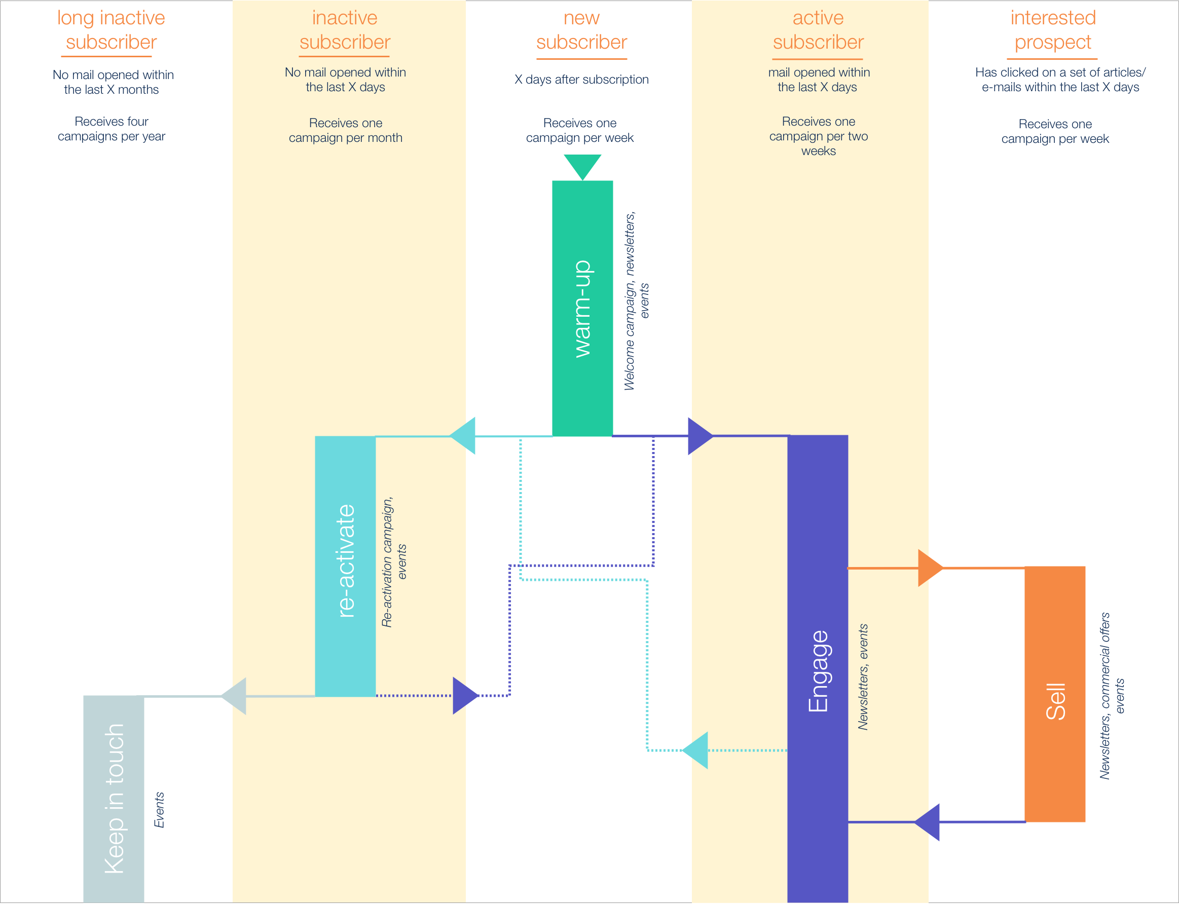 Die geïnteresseerde ontvangers krijgen een aparte campagne met, onder andere, een uitnodiging voor een demonstratie. Bij bestaande klanten kan deze campagne ook gericht zijn op retentie of upsell. Een geïnteresseerde ontvanger krijgt de nieuwsbrief, events en de upsell-campagne. Die laatste heeft natuurlijk de hoogste prioriteit. Dit resulteerd in ongeveer één mail per week.