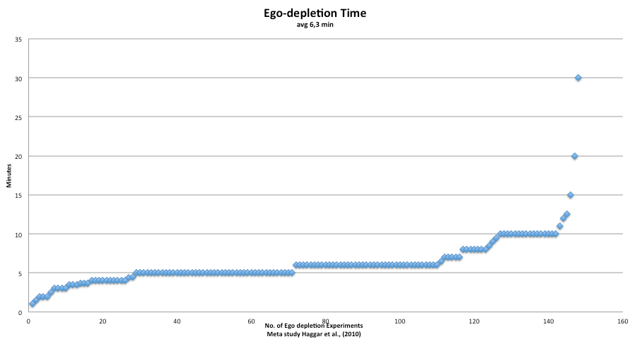 Ik moet je bekennen dat ik er erg aan twijfel (zie ook de reactie van Jacob Wiebenga op de blogpost van Bart). Als ik kijk naar wat voor opdrachten mensen krijgen in wetenschappelijke onderzoeken om ze ego depleted te krijgen, dan valt niet alleen op hoe complex die zijn maar vooral ook hoelang ze duren. Omdat ik nogal geïntrigeerd raakte door de blogpost van Bart heb ik dat laatste uitgerekend aan de hand van een meta-studie naar ego depletion door Hagger et al., (2010).