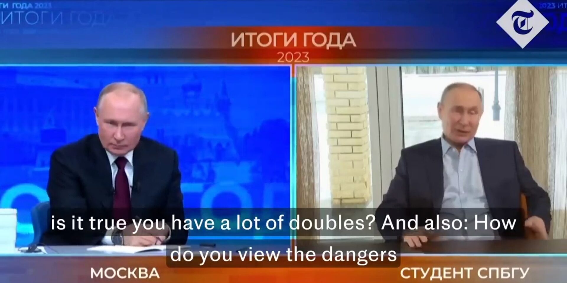 De vraag werd ontvangen met gelach van het publiek en een korte pauze van een ernstig kijkende Poetin. Hij reageerde uiteindelijk door te zeggen: “Ik zie dat je op mij lijkt en met mijn stem spreekt. Maar ik heb erover nagedacht en besloten dat er maar één persoon moet zijn die op mij lijkt en met mijn stem spreekt, en dat zal ik zelf zijn.”