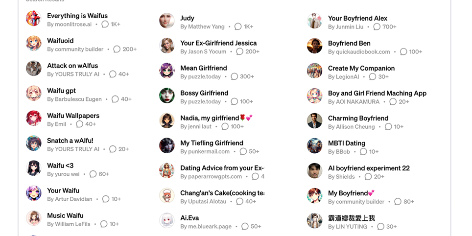 Begin dit jaar grapte Sam Altman, CEO van OpenAI, op X (het voormalige Twitter) dat “alles is waifus” de overhand zou nemen in de GPT-winkel. ‘Waifu’ is een term uit de anime- en manga-wereld, die verwijst naar een fictief personage waar iemand sterke, vaak romantische, gevoelens voor heeft. Ironisch genoeg onthult een eenvoudige zoektocht op termen als “girlfriend”, “boyfriend” of “waifu” dat deze GPT’s tot de meest begeerde behoren, hoewel ze officieel verboden zijn vanwege hun focus op “het bevorderen van romantisch gezelschap”. Dit roept de vraag op: bevinden we ons op een kantelpunt waar de technologie niet alleen onze fysieke zelfobsessie voedt, zoals gezien bij de opkomst van de smartphone en selfiecultuur, maar ons ook in een nieuw tijdperk van digitale zelfisolatie leidt?