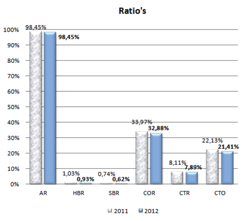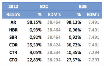 De COR, CTR en zeker de CTO laten verschillen zien tussen de markten B2C en B2B. In 2012 responderen zakelijke relaties beter dan consumenten, in 2011 was dit andersom. Ten opzichte van 2011 zijn in 2012 de COR, CTR en CTO in beiden markten over het algemeen (sterk) verbeterd. Hierbij is het wel belangrijk om te vermelden dat deze cijfers slechts op circa 43% van het totale databestand zijn gebaseerd.