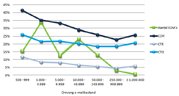 Ook de omvang van het e-mailbestand is bepalend voor de gemiddelde ratio’s. In de AR zijn nagenoeg geen verschillen gemeten tussen de categorieën. De SBR en HBR liggen bij de kleinere EDM’s tot 5.000 e-mailadressen wat hoger dan bij de grotere EDM’s. Net als in 2011 is in 2012 de COR opmerkelijk hoger in de categorie van de kleinste EDM’s (41,44%) dan in de opvolgende categorieën. Naarmate de e-mailbestanden groter worden, is de trend van de COR dalende. De dalende trend is tevens te zien bij de CTR en ook grotendeels bij de CTO. Dit suggereert dat e-mailings naar een relatief klein bestand gerichter en relevanter zijn voor de ontvanger en daardoor beter scoren dan e-mailings naar een relatief groot bestand.