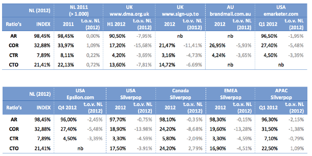 Om een vollediger beeld te krijgen van de gemiddelde ratio’s, is het natuurlijk interessante om de Nederlandse cijfers met buitenlandse e-mailbenchmarks te vergelijken. Zo eenvoudig is dat echter niet. Zo lopen de periode's, definities en betrouwbaarheid behoorlijk uiteen.