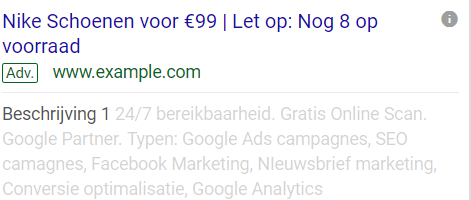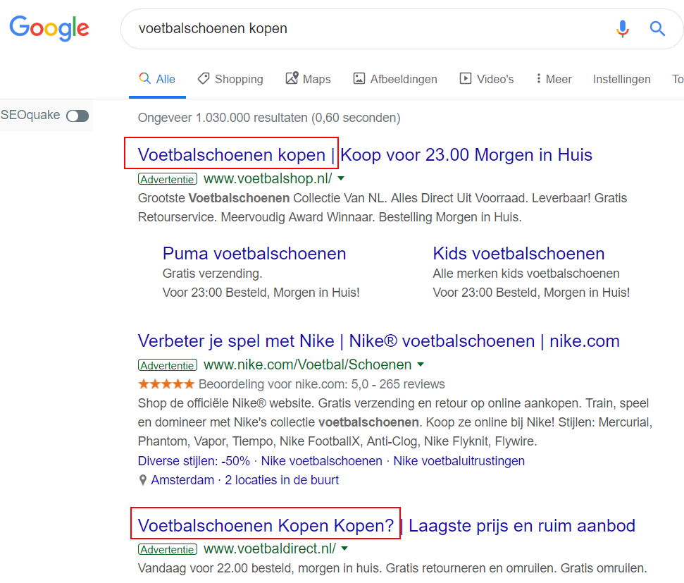 We maken allemaal wel eens advertenties waarin we het zoekwoord letterlijk in de headline terug laten komen. Google maar eens op bijvoorbeeld ‘Voetbalschoenen kopen’: