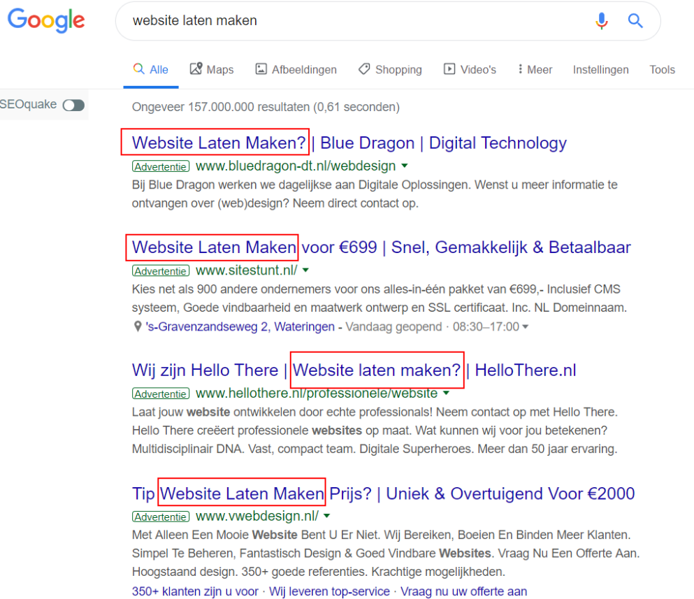 Van de drie advertenties heeft de bovenste letterlijk de zoekopdracht in beeld (en de onderste zal met Keyword Insertion een klein foutje hebben gemaakt). Een ander voorbeeld: ‘Website laten maken’: