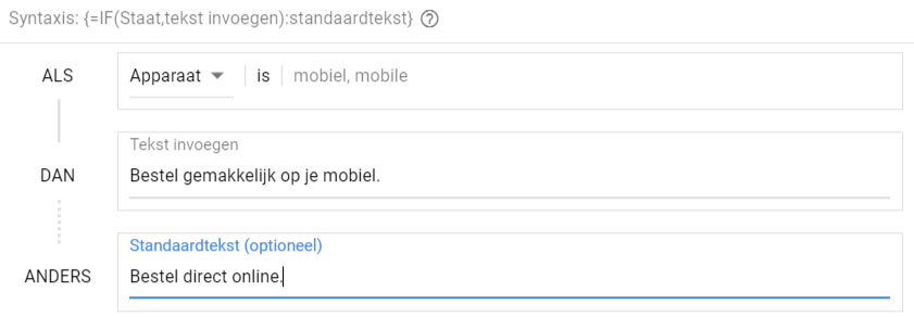 Met de IF-functie kun je in Google Ads advertenties personaliseren op basis van voorwaardes. Een ‘If this, then that’-scenario zeg maar. Dit ziet er als volgt uit: