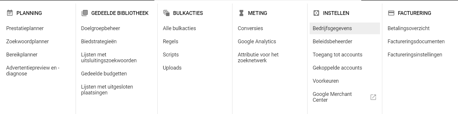 De zaken die je dynamisch wilt inladen, zet je in de feed die je vervolgens uploadt via ‘Bedrijfsgegevens’ onder de ‘Tools en instellingen’-knop in de Google Ads-interface: