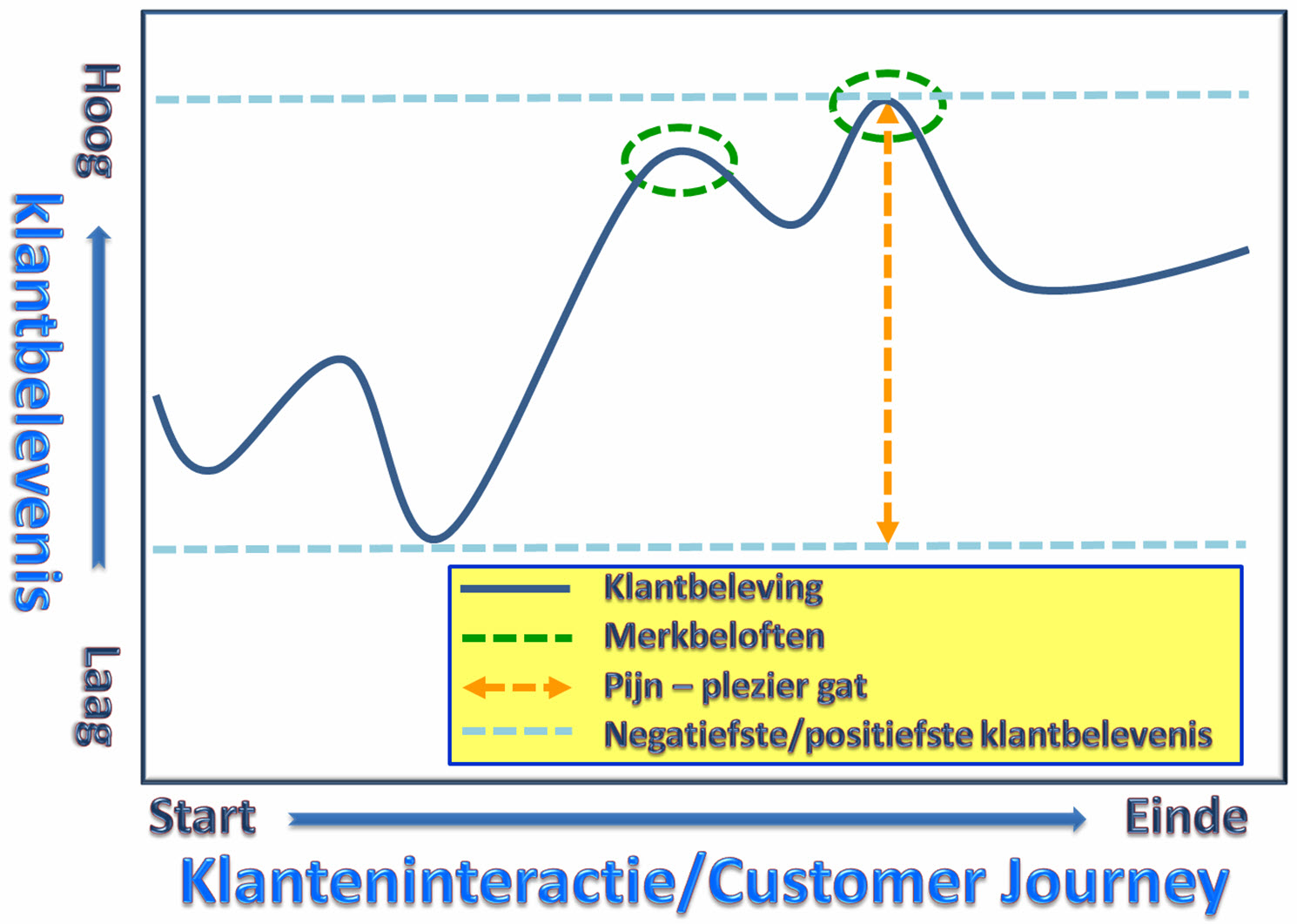 Zoals Sampson Lee aantoonde, blijkt bovendien dat klantloyaliteit vergroot wordt door het goed kiezen van pieken (op merkbeloften en belangrijke aspecten voor klanten) en dalen (boven een bepaald minimum) van klantervaringen: het “pijn – plezier gat” genoemd. Ook blijkt het laatste gedeelte van een ervaring sterke invloed heeft op hoe we ons de totale ervaring herinneren en beoordelen.
