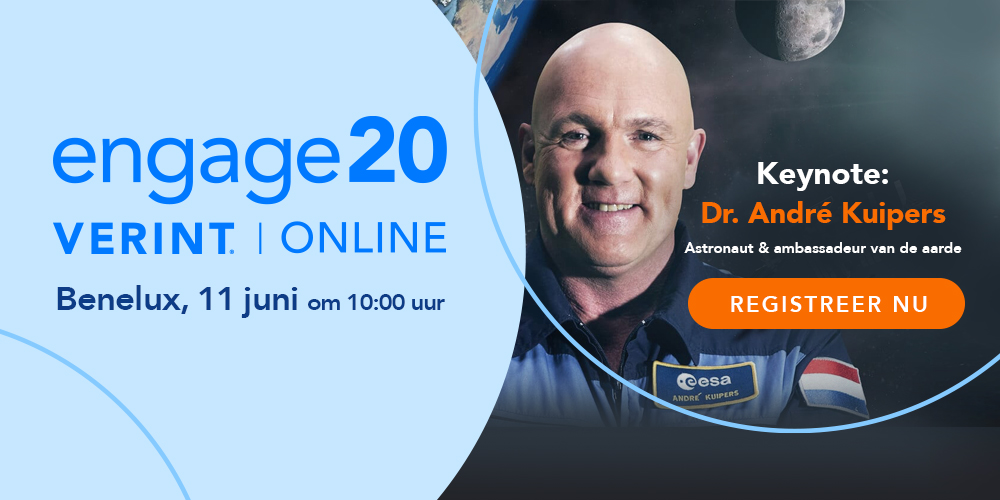 Customer Engagement, CX en de nieuwste technologie op dit vlak, daarvoor log je om 10.00 uur in bij Engage Online Benelux. Niemand minder dan astronaut André Kuipers zal een keynotepresentatie geven over ‘Innovate to Infinity and Beyond’, waarin hij je meeneemt op reis door de ruimte en zijn visie op innovatie, techniek en duurzaamheid. Daarnaast delen klanten van Verint hun lessen en successen op het gebied van medewerker- en klanttevredenheid en nieuw toegepaste technologieën. Zij zullen spreken over onderwerpen als: de manier waarop ze werken tijdens COVID-19, customer experience, employee engagement, Speech Analytics en Online Communities.