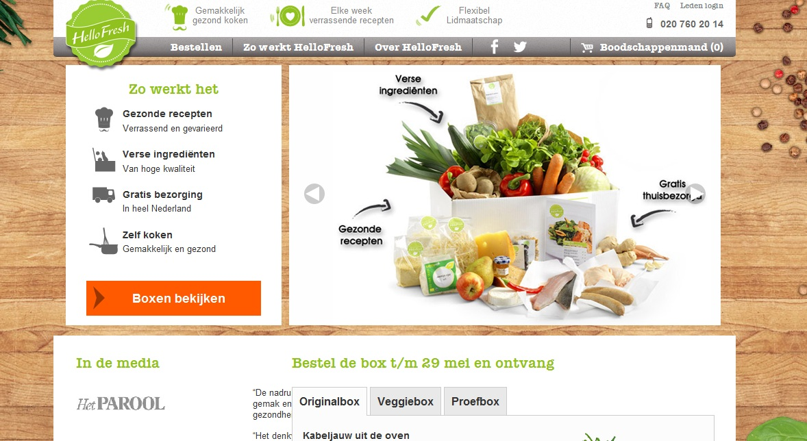 Een online initiatief in Nederland die online verkoop van (verse) levensmiddelen aanbiedt is Hello Fresh. Hello Fresh biedt online bestellen van verse levensmiddelen op een originele manier aan. Bij Hello Fresh kan een consument recepten met verse ingrediënten voor meerdere dagen in een box bestellen. Je wordt verrast door de leuke recepten, en het biedt gemak omdat je niet naar de supermarkt hoeft te gaan. Dit concept helpt de consument in meerdere facetten bij het kopen van levensmiddelen. Wil een consument levensmiddelen online kopen dan dient de retailer de consument te helpen bij het oriënteren, planning en shoppen. Dan biedt namelijk het online kanaal meer voordeel dan de (bestaande) kanalen. Tevens zal de focus op prijs minder worden.