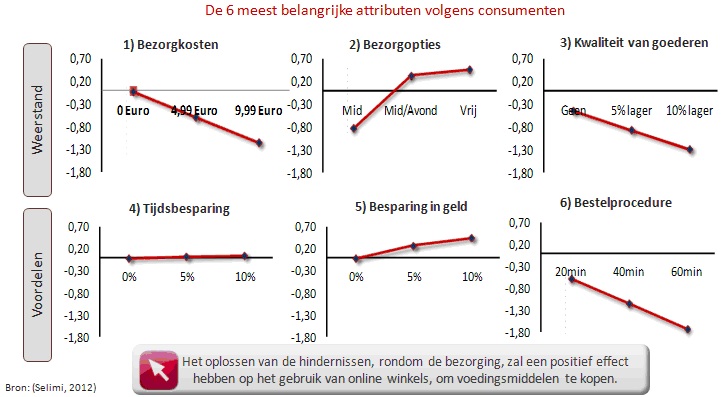 Wil de online levensmiddelenmarkt verder gaan groeien, dan dienen diverse barrières te worden verwijderd. Uit onderzoek van Samir Selimi (Capgemini Consulting) blijkt dat zes hoofdelementen van invloed zijn op de adoptie van het online kanaal om boodschappen te doen. De eerste drie elementen: ‘verzendkosten’, ‘verzendopties’ en ‘de kwaliteit van de geleverde goederen’ zorgen bij een slechte invulling voor weerstand. De laatste drie, ‘prijs’, ‘tijdbesparing’ en ‘bestelprocedure’, hebben juist een positief effect op het gebruik van het online kanaal. Niet alleen verschilt het effect van deze elementen onderling, maar ook in de niveaus binnen de elementen zelf (zie onderstaande grafiek). Tevens is uit het onderzoek gebleken dat de elementen die voor weerstand zorgen twee keer meer effect hebben, dan de elementen die een positief effect hebben. Dit laat zien dat retailers eerst de elementen aan moeten pakken die weerstand opleveren, alvorens voordelen te gaan benoemen en aanbieden.
