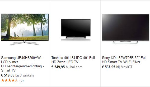 Naast je eigen website is het wellicht nog belangrijker om reviews weer te geven daar waar consumenten hun online zoektocht beginnen: Google. Als je de Google Rich Snippet implementeert op je website, is Google in staat om naast de paginatitel, korte beschrijving en de website-url ook het aantal reviews en de gemiddelde beoordeling weer te geven in de zoekresultaten. Dit zal de click-through-rate naar je productpagina aanzienlijk verhogen. Op welk van de onderstaande links zou jij als eerste klikken?
