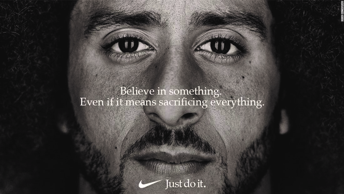 “Believe in something. Even if it means sacrificing everything.” De slogan van de nieuwe advertentiecampagne van Nike. De gewezen American Football-speler Colin Kaepernick is hierbij het nieuwe boegbeeld. Door tijdens het spelen van het Amerikaanse volkslied een kniebuiging te maken, vroeg hij aandacht voor de slechte levensomstandigheden, het racisme en de schending van burgerrechten van zwarte Amerikanen. Een actie die hem uiteindelijk de kop kostte.