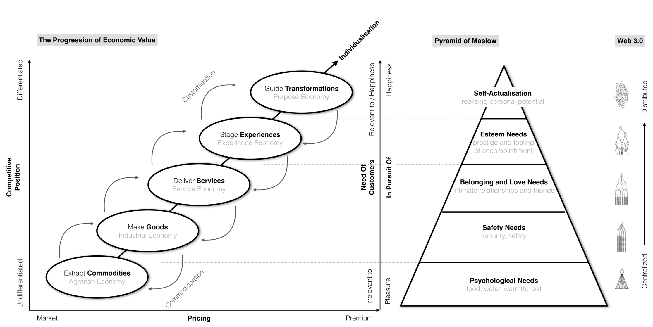 De wereld van hyperrealiteit betekent een nieuwe economie waar op een totaal andere manier met mensen wordt gecommuniceerd. Over verschillende multimedia-kanalen, met ieder hun eigen normen en waarden en dito cultuur, van centraal gestuurd naar decentraal georganiseerd, van welvaart naar welzijn, van korte termijn genot naar langdurig geluk, toegang in plaats van eigendom, relaties in plaats van transacties, niet het bedrijf maar de mens staat centraal: dit zijn de nieuwe ontwerpprincipes van deze betekeniseconomie.