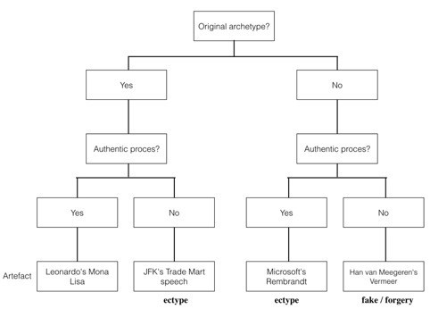 Door een eenvoudige beslisboom te doorlopen is te achterhalen met wat voor soort kopie men te maken heeft. Zo is de tekst van Kennedy’s speech origineel, maar de stem die de tekst voorleest is niet authentiek, omdat hij is gesynthetiseerd door software. Zo is een door Microsoft gecreëerde Rembrandt niet origineel, omdat Rembrandt van Rijn niet de schilder is, maar het productieproces wel authentiek, omdat de stijl en de manier waarop de verf door de software op het doek wordt aangebracht één op één te vergelijken is met de wijze waarop de meester zelf schilderde.