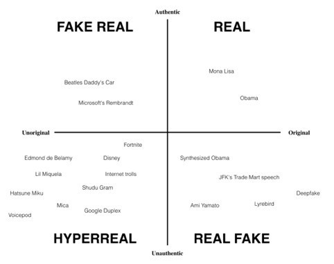 De opkomst van nieuwe technologieën – CGI Influencers zoals Lil Miquela, Shudu Gram, Hatsune Miku en Mica, voice-technologieën zoals Lyrebird, Voicepods en Google Duplex, maar ook Deepfake-technologieën – zorgt ervoor dat we als individu, als bedrijf en als maatschappij langs de as van authenticiteit naar beneden bewegen. We scheppen een wereld waarin niets is wat het lijkt. Een wereld die door Generatie Z (de Synthetische Generatie) met groot gemak wordt bewandeld, omdat ze zijn opgegroeid in deze wereld. Zij kennen geen tijdperk voor het internet. Het internet is er in hun ogen altijd geweest. Het niet-authentiek zijn is voor hen per definitie de nieuwe authenticiteit.