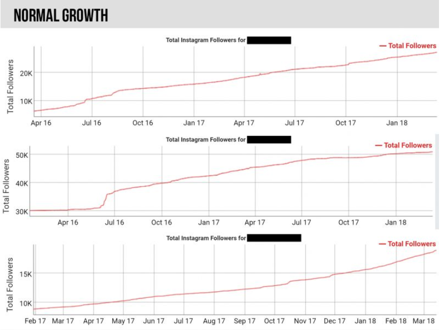 Het verloop van de volgers over een langere periode maakt al veel duidelijk. Een gezond influencer-account heeft een organische groei in het aantal volgers: