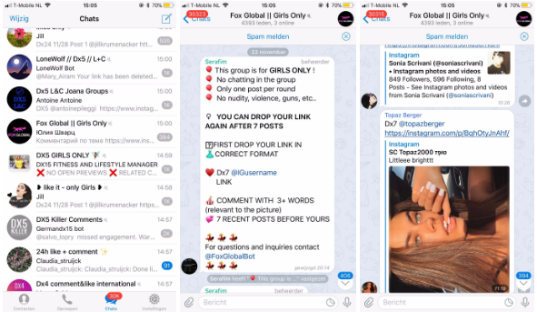 Naast het inkopen van volgers en likes is er nog een oneerlijke (maar niet gekochte) manier om het algoritme van Instagram om te tuin te leiden: het gebruik van Telegram Groups of Pods. Grote groepen influencers hebben zich op Telegram verzameld om elkaars foto’s te liken en te commenten. Er worden afspraken gemaakt over hoe vaak je moet posten, hoe vaak je andermans content moet liken en uit minimaal hoeveel woorden je comment moet bestaan (yes, ook dit laatste is van invloed op het Instagram algoritme). Een moderator houdt streng toezicht op dit hele gebeuren en zodra je je niet aan de afspraken houdt, wordt je uit de groep gezet.