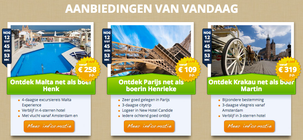 Alleen vandaag geldig! Er is een tijdsdruk, want je hebt nog maar 15 uur en 23 minuten om te beslissen. Een mooi voorbeeld van een website die dit principe van schaarste koppelt aan een tijdslimiet is BoekVandaag.nl. Bij BoekVandaag.nl zie je dat de teller afloopt. De seconden, en minuten lopen af en de tijdsdruk wordt opgebouwd. Je hebt nog maar beperkte tijd om een keuze te maken.
