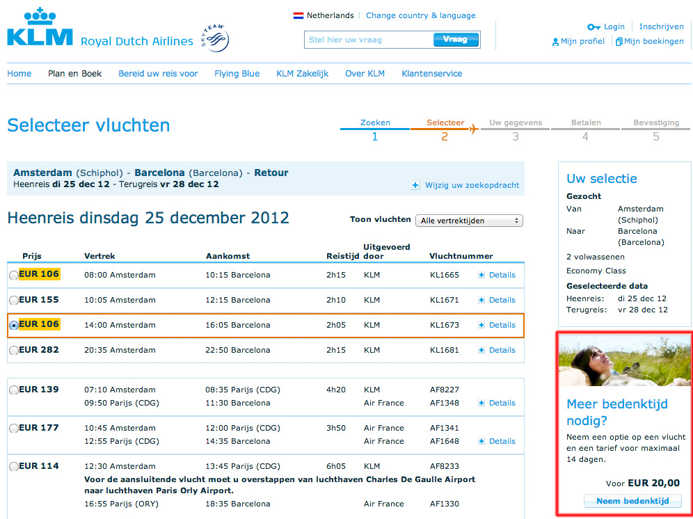 Wat KLM, als aanvulling op dit principe, erg goed doet is het aanbieden van de mogelijkheid om tegen betaling de vlucht in optie te houden. Geweldig bedacht natuurlijk. Bezoekers kopen hiermee zekerheid, maar zitten nog nergens aan vast. Ze hebben nog 14 dagen de tijd om eventueel een goedkoper alternatief te vinden, maar zijn nu al zeker van deze vlucht.