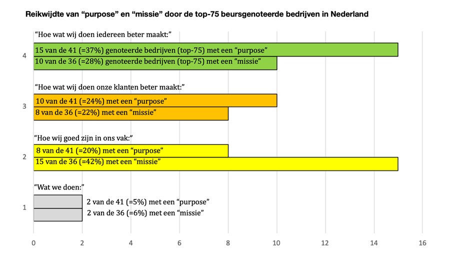 Kwantitatief is de reikwijdte van de “purpose” en “missie” die een deel van de top-75 beursgenoteerde bedrijven in Nederland benut als volgt in kaart te brengen. Van de top-75 benoemen 41 bedrijven een purpose (55%) en 36 benoemen een missie (48%). Van die bedrijven is de verdeling over de vier onderscheiden ambitieniveaus als volgt: