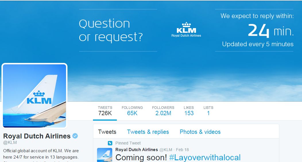 KLM had in 2013 een responstijd van 1 uur, afgelopen jaar 30 minuten en dit jaar gemiddeld 46 minuten bij vijf test-tweets. De luchtvaartmaatschappij geeft in haar account aan wat de responstijd ongeveer zal zijn. In de afgelopen drie jaar bleek de gemeten responstijd steeds overeen te komen met wat er op dat moment ‘expected’ was. In het geheel snel, consistent en accuraat, maar het blijven lange minuten wachten.