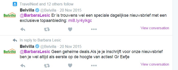 Belvilla reageerde in twee delen, waarbij in de tweede tweet de call to action werd vermeld en een slim antwoord werd gegeven op de vraag. ‘Eefje’ maakt zich ook bekend als de agent die antwoordt. Er wordt geen naam herhaald naast de @naam.