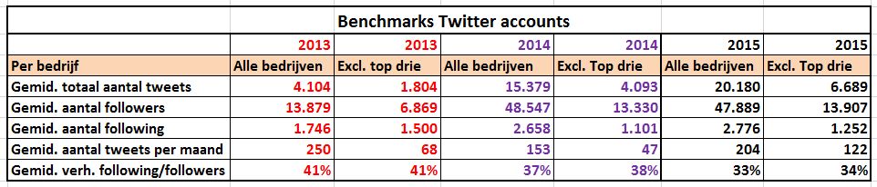 Opvallend is dat het gemiddeld aantal volgers amper meer toeneemt, het aantal gevolgde personen door de bedrijven zelf ook niet. Dit geeft aan dat Twitter minder actief ingezet wordt en/of verzadigd raakt. Bedenk ook dat slechts 2 tot 5 procent van de volgers een update ook daadwerkelijk ziet in zijn of haar timeline. En dat bereik wordt, zonder te adverteren, alleen maar minder. Dit betekent dat een bereik van 13.907 followers rond de 665 lezers oplevert: dramatisch weinig! Het ‘hefboomeffect’ van engagement (retweeten, liken, et cetera) kan dit aantal nog wel laten stijgen.