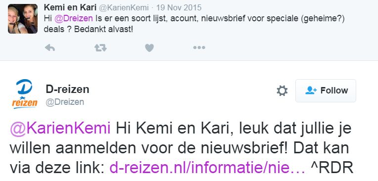 In het antwoord van D-reizen, zoals hierboven weergegeven, ging het juist goed: persoonlijk, vriendelijk en heeft ook de klikbare link.