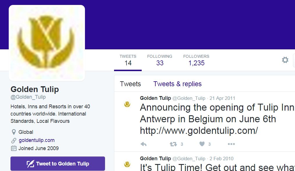 Een aantal concrete voorbeelden hiervan: Golden Tulip beschikt niet over de handle @GoldenTulip en deelnemende hotels hanteren eigen varianten, zoals @Golden_Tulip_hotelnaam en @GThotelnaam. Veel deelnemende hotels gebruiken wel de hashtag #goldentulip. Het account @Golden_Tulip lijkt nog het officiële account te zijn, maar is sinds 2011 (!!!) niet meer gebruikt, heeft een zeer amateuristische uitstraling en geeft geen reactie.