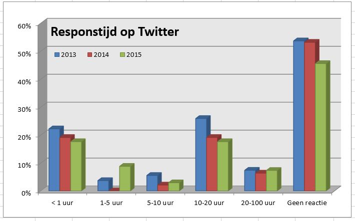 Na de dramatische nonrespons-cijfers van 2013 (54 procent) en 2014 (53 procent) bleek helaas ook dit jaar 46 procent van de bedrijven totaal niet op de testtweet te reageren. Er is ook dit jaar geen duidelijk beeld te scheppen over het type bedrijven dat niet reageert.