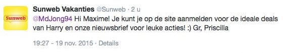 De stijl van Sunweb is wat de meeste bedrijven doen: in dit geval ook met een leuk haakje naar ‘Harry’, binnen 2 uur, maar helaas zonder link. Het hanteren van de je/jij-stijl in de antwoorden is de norm geworden.
