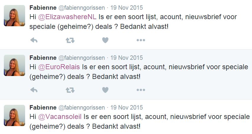 Er is geen enkel (!) bedrijf geweest die met een tegenvraag kwam of met een alternatief als de gevraagde deals niet beschikbaar waren. De meeste bedrijven opperden hun nieuwsbrief. KLM kwam nog het dichtst in de buurt met de tweet: “Hi Angela, we hebben helaas geen geheime aanbiedingenclub, maar wist je dat nu de Vijf Dagen Voordeel bezig zijn?” In een tweede aansluitende tweet stond de nieuwbrieflink.