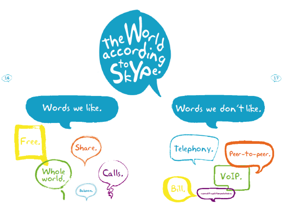 Skype zet zich door zijn vocabulaire af tegen alles wat moeilijk en technisch is. Visuele en verbale communicatie zijn bij Skype zo perfect complementair.