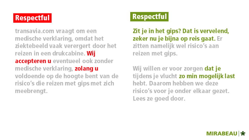 Het redesign van transavia.com was aanleiding om ook de verbal identity onder de loep te nemen. Een analyse van de bestaande tone-of-voice leverde interessante resultaten op. De merkwaarden ‘enthousiast’, ‘oprecht’ en ‘betrokken’, die binnen de organisatie zelf ook echt voelbaar zijn, kwamen niet terug in de toon van de websiteteksten.