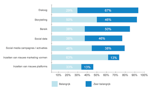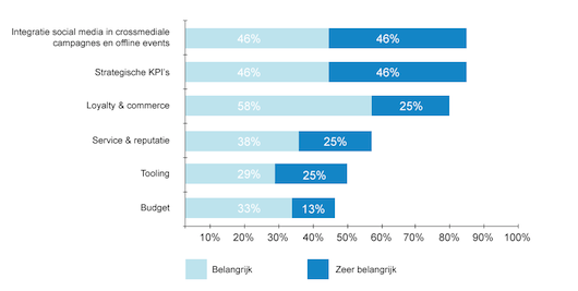 De organisatie van social media bij merken staat. Het komende jaar geven merken minder prioriteit aan zaken als tooling en budget. De tooling is ingericht en het budget is inmiddels vrijgemaakt. Een aantal brand leaders geeft aan minder nadruk op interne activatie van medewerkers op het gebied van social te leggen. Enerzijds hebben merken dit proces al doorlopen; anderzijds geven merken aan dat zij hier nog niet klaar voor zijn en eerst duidelijke guidelines moeten ontwikkelen. Tenslotte geven brand leaders aan dat het uitbreiden van hun socialmedia-inzet met nieuwe kanalen niet aan de orde is. De focus ligt op het verbeteren van de huidige kanalen en het bereik hiermee vergroten, in plaats van nog een extra kanaal toe te voegen.