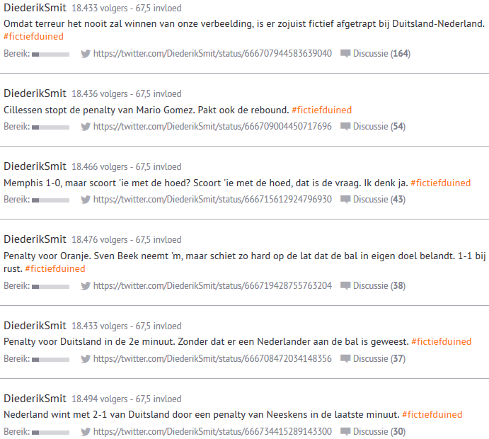 - Humor was er gelukkig ook. Toen de Belgische politie vroeg om socialmediastilte, reageerden Belgische tweeps met kattenplaatjes. Om te terroristen te verwarren, maar vooral ook om van zich af te bijten. Dat deed Nederland ook toen Duitsland-Nederland werd afgelast, onder aanvoering van Diederik Smit, met #fictiefduined: