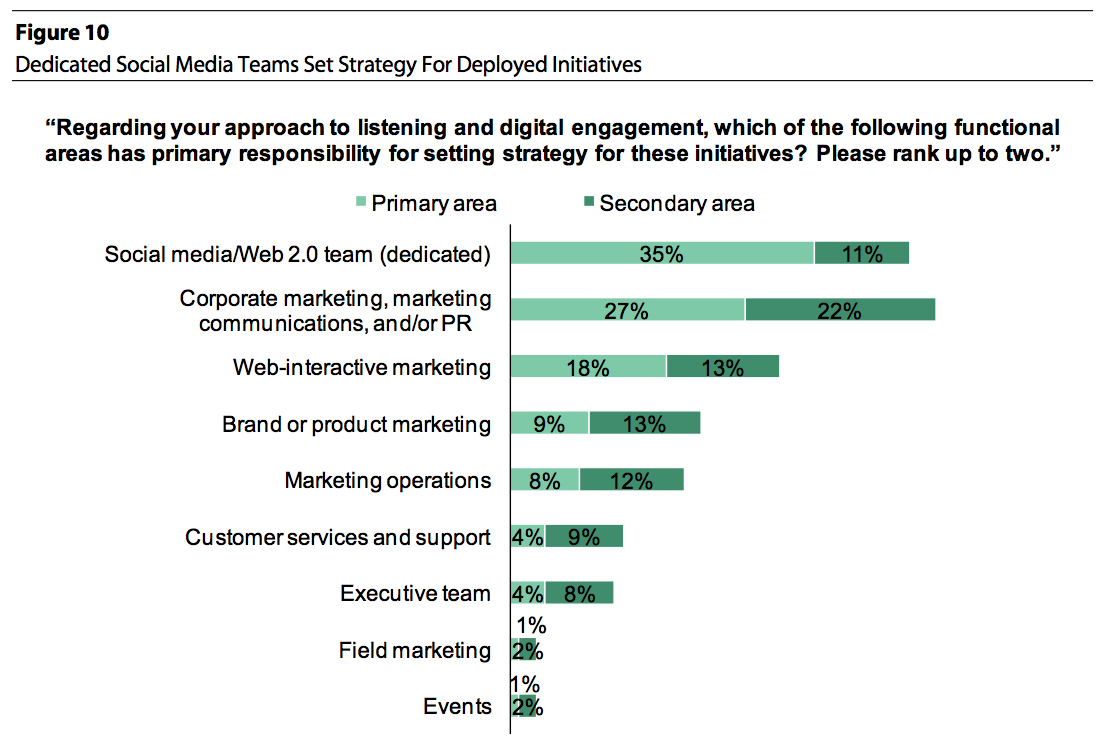 Als we kijken naar de integratie van de sociale dimensie in andere zakelijke functies is het pas huilen met de pet op. Je merkt het aan de manier waarop social media-teams worden gestructureerd en tot welke afdeling ze worden toebedeeld. We evolueren naar een toenemende integratie van de marketingrealiteit met social als een hoeksteen. Die integratie speelt trouwens ook in andere zakelijke processen en zelfs in de gehele economie. De grens tussen IT, marketing en economie vervaagt met veranderingsprocessen tot gevolg. Denk bijvoorbeeld ook aan het nieuwe werken en alle aandacht die naar 'collaboration en unified communications' gaat of aan de discussies over de rol van verschillende managers in dit snel veranderende landschap.