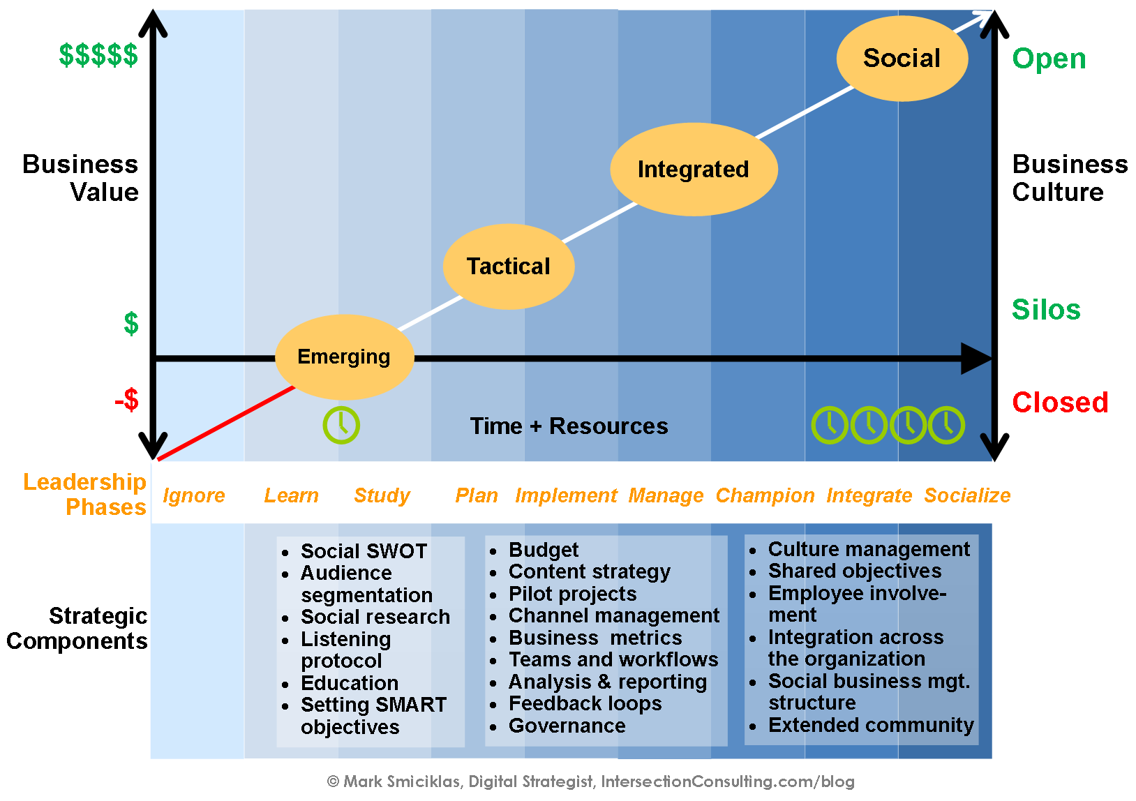 De vraag is hoe ver jij als bedrijf staat in die andere adoptiecurve: die van de social media-maturiteit. De meeste bedrijven zitten nog in de fase van emerging en tactical. Integratie is zoals je verder zult zien zelden een realiteit, de volgende stappen zijn nog uitzonderlijker.