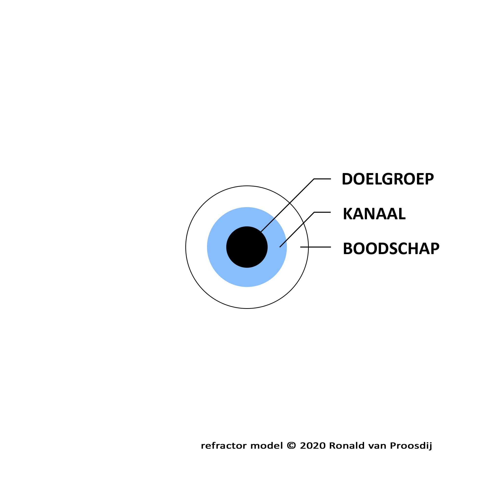 Als het doel van de content die je gaat maken duidelijk is, ga je kijken naar je doelgroep en wat de boodschap aan hen is waarmee je het doel kunt bereiken. In onderstaand model is dit vormgegeven in de vorm van een oog. Hierin staat de doelgroep centraal (pupil) en is deze te bereiken via een kanaal (iris). Het oogwit stelt de boodschap voor. Deze doelgroep is te bereiken via een kanaal. Het oogwit staat centraal voor de boodschap die je wilt dat de doelgroep bereikt. Ondanks dat dit model geënt is op het visuele zintuig, geldt dit natuurlijk ook voor het gehoorzintuig.