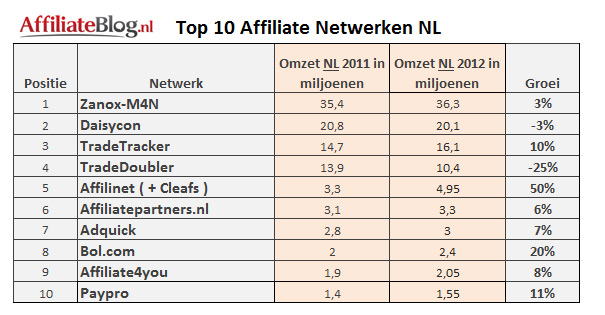 De fusie Zanox-M4N is voor het tweede jaar op rij het grootste affiliatenetwerk van Nederland. Daisycon volgt met een minimale daling ten opzichte van 2011. Tradetracker timmert zowel nationaal als internationaal aardig aan de weg. De verwachtingen van Tradedoubler heeft Jochem naar beneden bijgesteld. Niet zozeer omdat 2012 zo’n slecht jaar was, maar omdat Tradedoubler in de lijst van 2011 te hoog werd ingeschat. Met de overname van Affili.net staat Tradedoubler op een stevige vijfde plaats. Naast dat Cleafs niet meer aanwezig is in de top 10, zorgde het faillissement van Testnet/iffiliate ervoor er twee nieuwe partijen in de top 10 staan: Adquick & Paypro.nl.