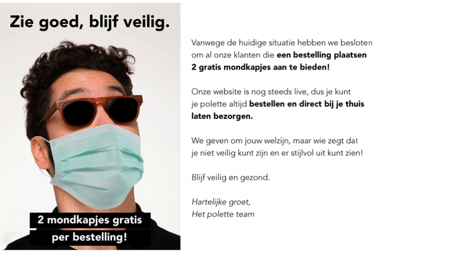 Belangrijk is natuurlijk dat de inhaker past bij het merk, dat de boodschap ook klopt en de campagne niet conflicteert met de verwachtingen van de omgeving. Zo viel de actie met twee gratis mondkapjes van het Franse brillenmerk Polette behoorlijk verkeerd in deze tijd waarin er een groot tekort aan veiligheidsmateriaal is bij het zorgpersoneel.